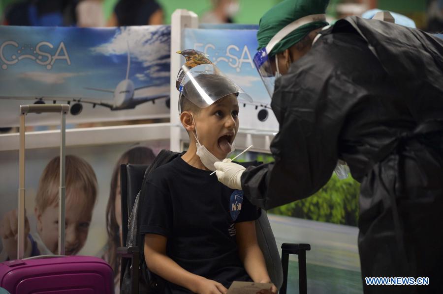 LA HABANA, 15 noviembre, 2020 (Xinhua) -- Personal médico toma una muestra para realizar una prueba para detectar la enfermedad causada por el nuevo coronavirus (COVID-19) a un niño en el Aeropuerto Internacional José Martí, en La Habana, capital de Cuba, el 15 de noviembre de 2020. El aeropuerto internacional de La Habana, el más importante de Cuba, reabrió el domingo sus operaciones bajo estrictas medidas sanitarias, luego de casi ocho meses de permanecer cerrado al tránsito aéreo comercial, informaron las autoridades locales. (Xinhua/POOL/Yamil Lage/AFP)