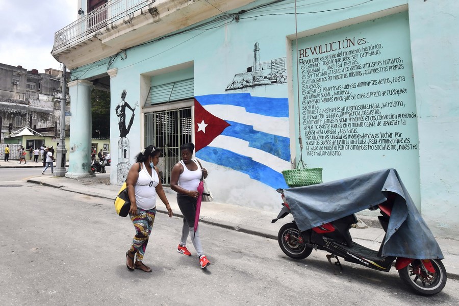 Mujeres conversan mientras caminan por una calle, en La Habana, capital de Cuba, el 6 de junio de 2022. (Xinhua/Joaquín Hernández)