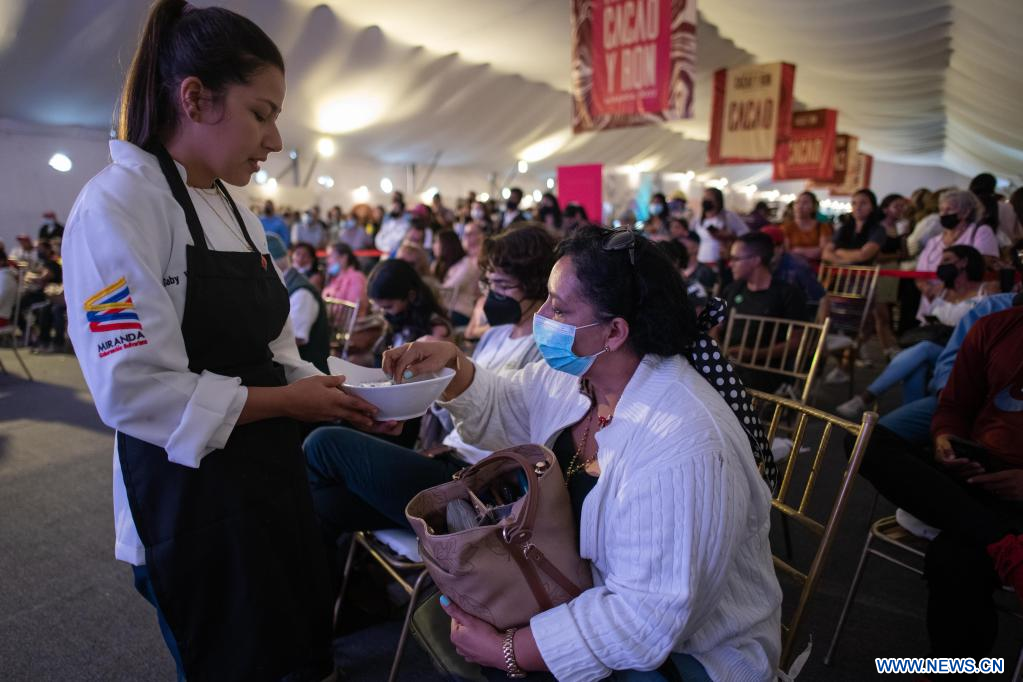 MIRANDA, 15 julio, 2022 (Xinhua) -- Una mujer participa en una degustación de chocolates durante la Expoferia Cacao y Ron Miranda 2022, en el municipio de Sucre, estado Miranda, Venezuela, el 15 de julio de 2022. La feria, que se realiza por primera ocasión, reúne a productores y comercializadores de la cadena productiva de ambos rubros provenientes de todo el país. (Xinhua/Marcos Salgado)