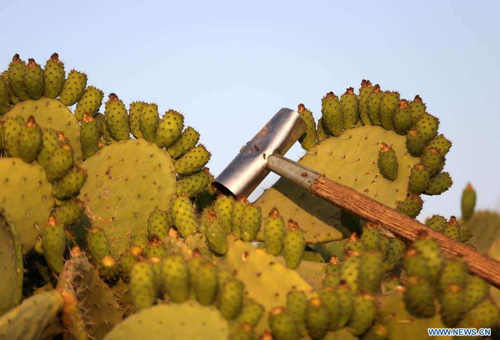 GAZA, 15 julio, 2022 (Xinhua) -- Imagen del 15 de julio de 2022 de frutos de tuna durante la temporada de cosecha en una granja, en el poblado de Abasan, en el este de la ciudad de Khan Younis, en el sur de la Franja de Gaza. (Xinhua/Yasser Qudih)