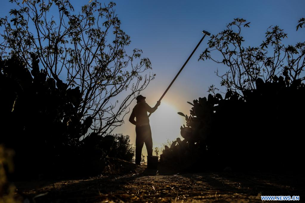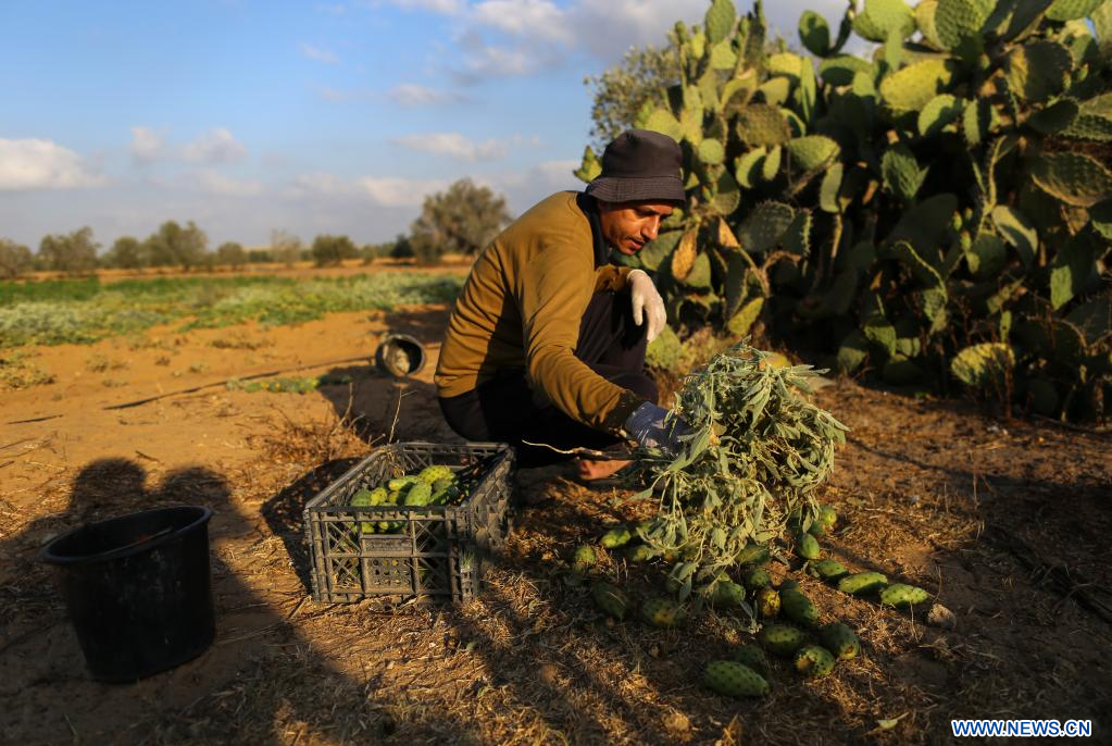 GAZA, 15 julio, 2022 (Xinhua) -- Un agricultor recolecta frutos de tuna durante la temporada de cosecha en una granja, en el poblado de Abasan, en el este de la ciudad de Khan Younis, en el sur de la Franja de Gaza, el 15 de julio de 2022. (Xinhua/Yasser Qudih)