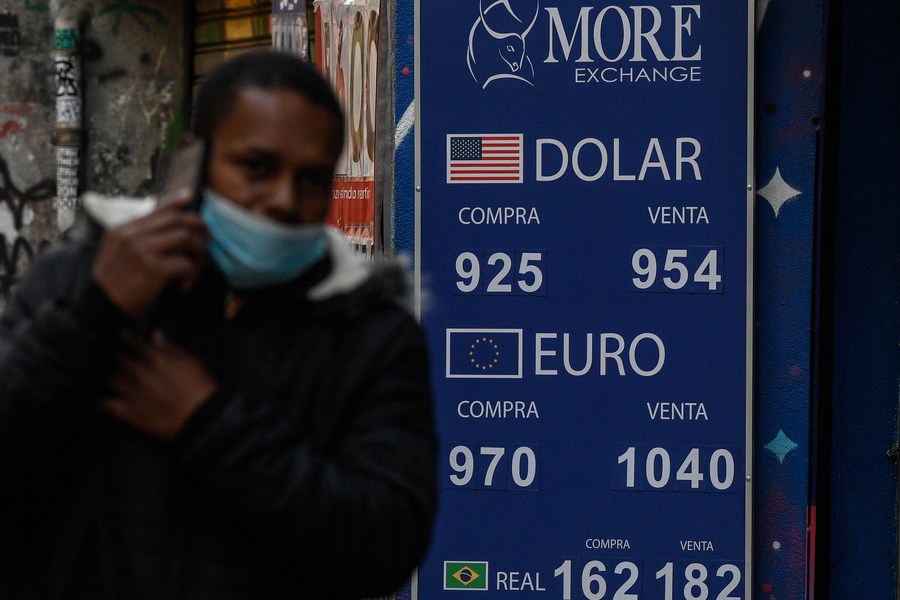 Un hombre camina frente a una casa de cambio, en Valparaíso, Chile, el 19 de julio de 2022. (Xinhua/Jorge Villegas)