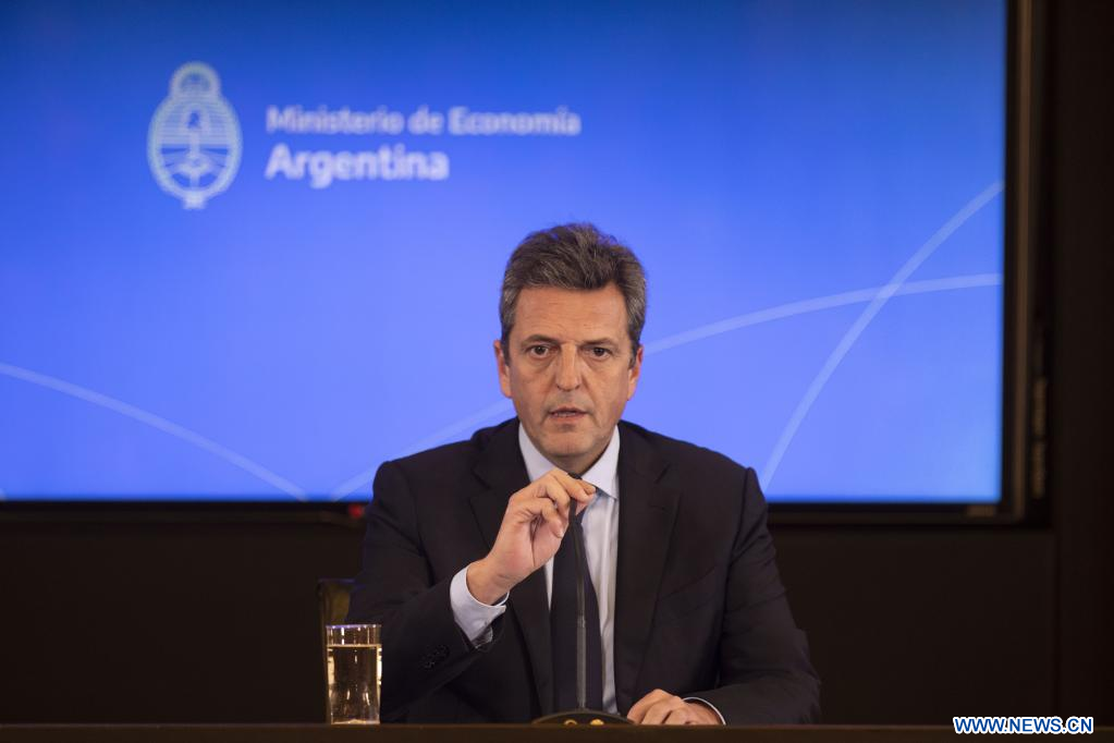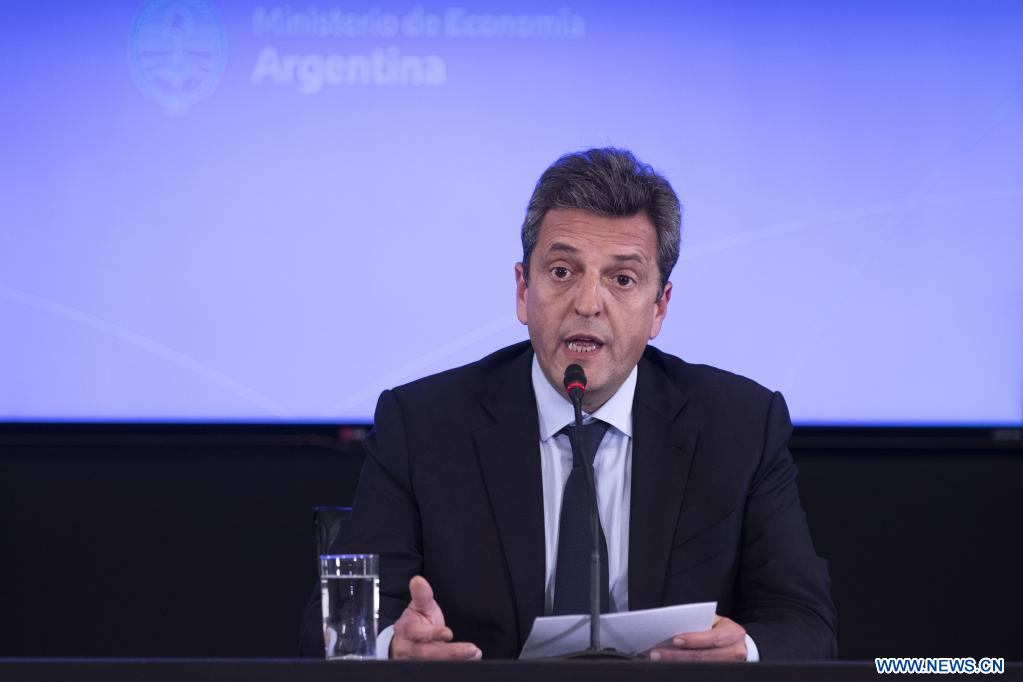 BUENOS AIRES, 3 agosto, 2022 (Xinhua) -- El ministro de Economía, Desarrollo Productivo, Agricultura, Ganadería y Pesca argentino, Sergio Massa, habla durante una conferencia de prensa ofrecida en el microcine del Ministerio de Economía, en la ciudad de Buenos Aires, capital de Argentina, el 3 de agosto de 2022. El presidente de Argentina, Alberto Fernández, posesionó el miércoles al dirigente político Sergio Massa como nuevo ministro de Economía, Desarrollo Productivo, Agricultura, Ganadería y Pesca. (Xinhua/Martín Zabala)