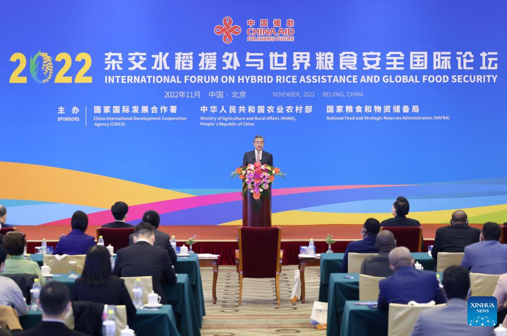 El consejero de Estado y ministro de Relaciones Exteriores chino, Wang Yi, lee el mensaje escrito del presidente chino, Xi Jinping, mientras asiste al Foro Internacional sobre Asistencia de Arroz Híbrido y Seguridad Alimentaria Mundial, el 12 de noviembre de 2022. (Xinhua/Wang Ye)