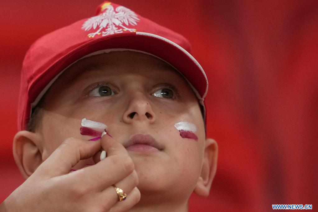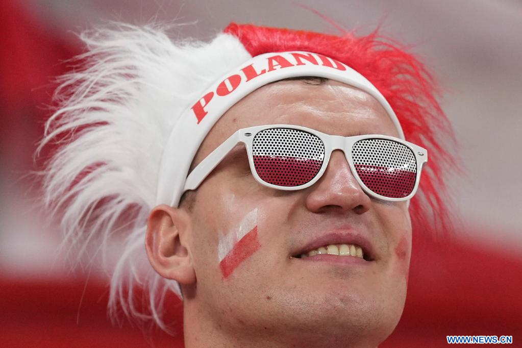 Un aficionado de Polonia reacciona previo al partido correspondiente a los octavos de final entre Francia y Polonia en la Copa Mundial de la FIFA 2022, en el Estadio Al Thumama, en Doha, Qatar, el 4 de diciembre de 2022. (Xinhua/Zheng Huansong)