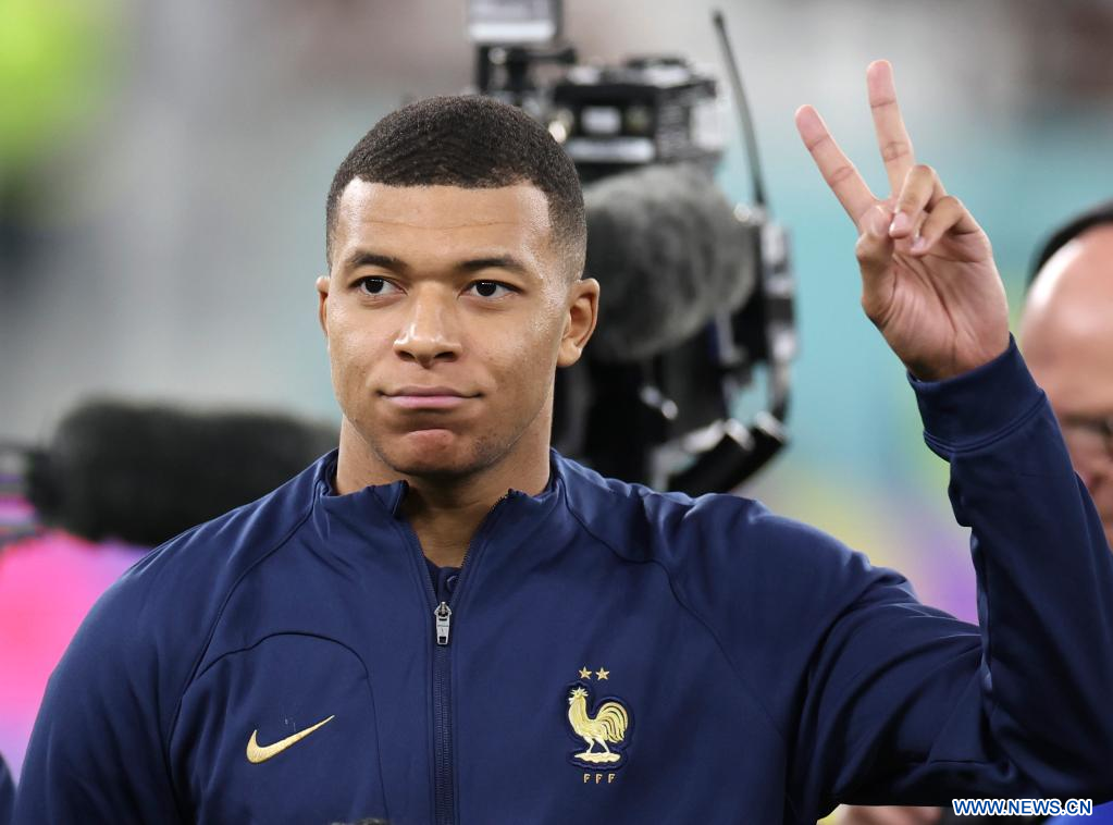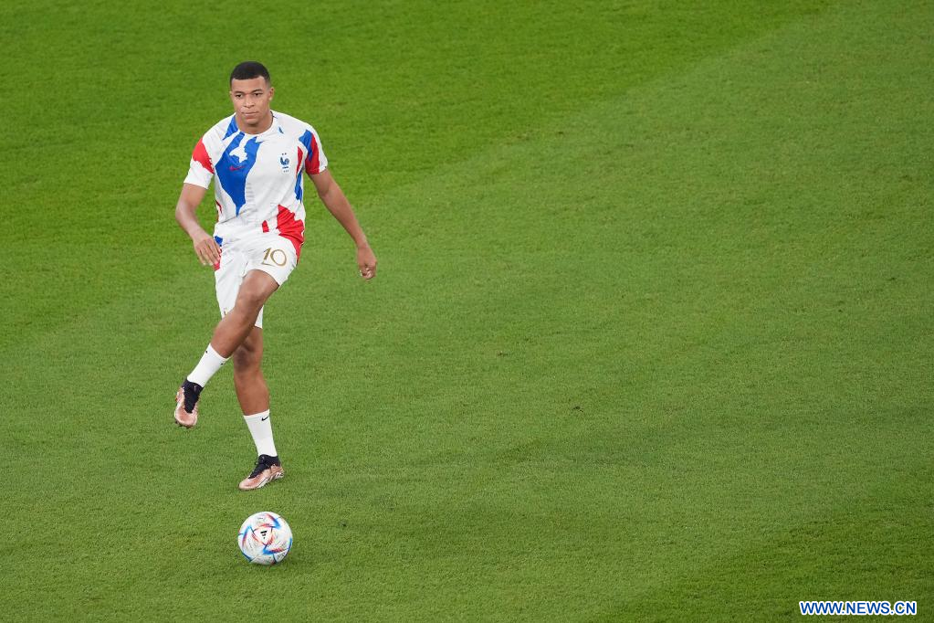 Kylian Mbappe, de Francia, calienta previo al partido correspondiente a los octavos de final entre Francia y Polonia en la Copa Mundial de la FIFA 2022, en el Estadio Al Thumama, en Doha, Qatar, el 4 de diciembre de 2022. (Xinhua/Meng Yongmin)