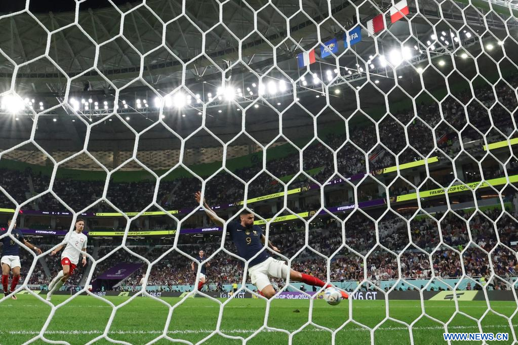Olivier Giroud (frente), de Francia, dispara para anotar durante el partido correspondiente a los octavos de final entre Francia y Polonia en la Copa Mundial de la FIFA 2022, en el Estadio Al Thumama, en Doha, Qatar, el 4 de diciembre de 2022. (Xinhua/Zheng Huansong)