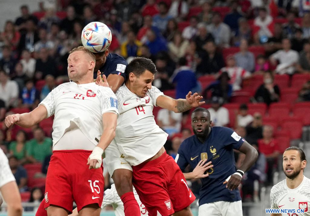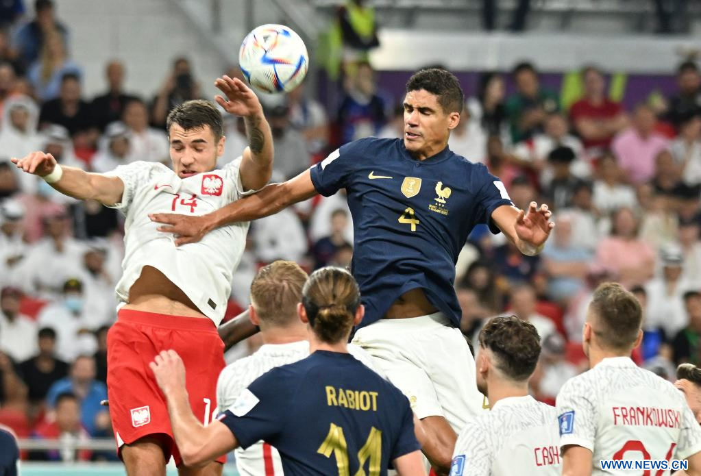 Jakub Kiwior (i), de Polonia, disputa el balón con Raphael Varane (4-i), de Francia, durante el partido correspondiente a los octavos de final entre Francia y Polonia en la Copa Mundial de la FIFA 2022, en el Estadio Al Thumama, en Doha, Qatar, el 4 de diciembre de 2022. (Xinhua/Xiao Yijiu)