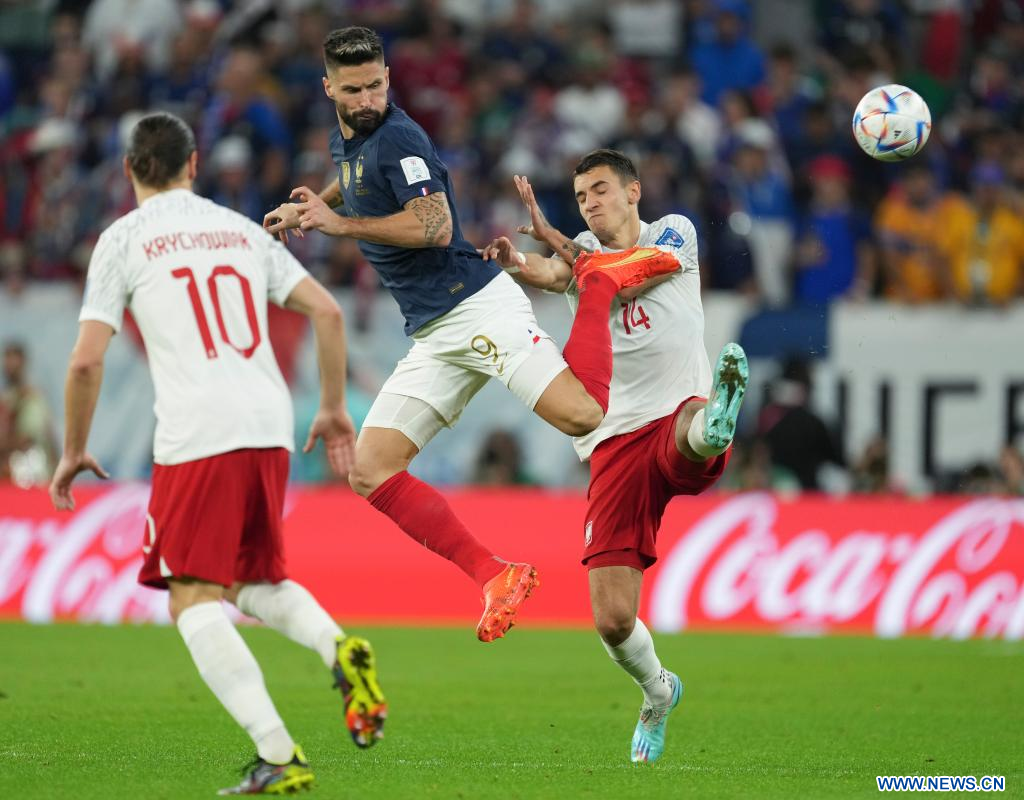 Olivier Giroud (c), de Francia, disputa el balón con Jakub Kiwior (d), de Polonia, durante el partido correspondiente a los octavos de final entre Francia y Polonia en la Copa Mundial de la FIFA 2022, en el Estadio Al Thumama, en Doha, Qatar, el 4 de diciembre de 2022. (Xinhua/Xiao Yijiu)