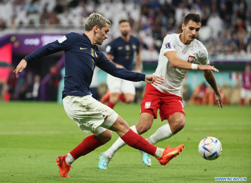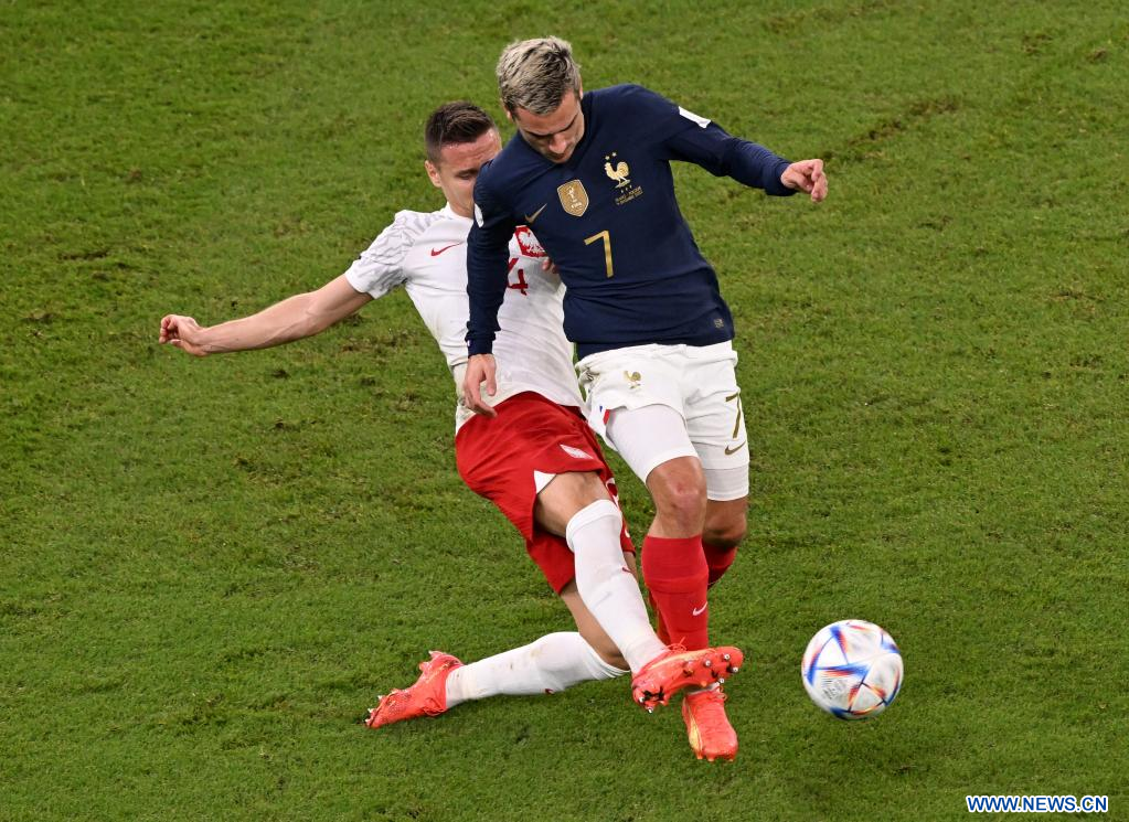 Antoine Griezmann (d), de Francia, disputa el balón con Przemyslaw Frankowski, de Polonia, durante el partido correspondiente a los octavos de final entre Francia y Polonia en la Copa Mundial de la FIFA 2022, en el Estadio Al Thumama, en Doha, Qatar, el 4 de diciembre de 2022. (Xinhua/Xia Yifang)