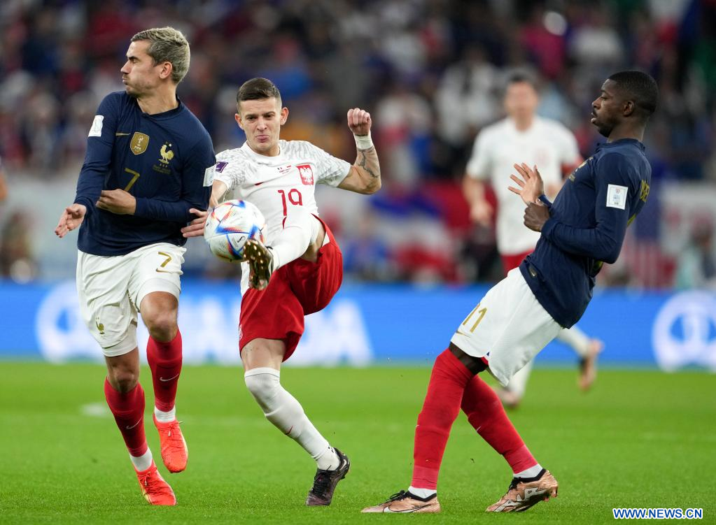 Antoine Griezmann (i), de Francia, disputa el balón con Sebastian Szymanski (2-i), de Polonia, durante el partido correspondiente a los octavos de final entre Francia y Polonia en la Copa Mundial de la FIFA 2022, en el Estadio Al Thumama, en Doha, Qatar, el 4 de diciembre de 2022. (Xinhua/Zheng Huansong)