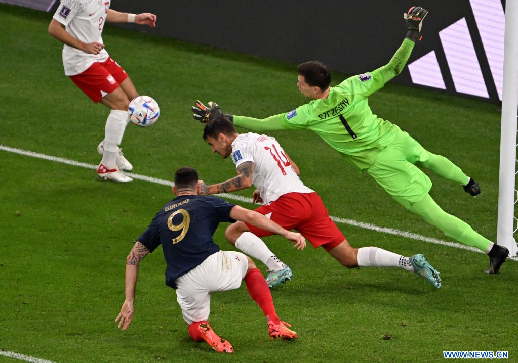 Olivier Giroud (d), de Francia, falla una anotación durante el partido correspondiente a los octavos de final entre Francia y Polonia en la Copa Mundial de la FIFA 2022, en el Estadio Al Thumama, en Doha, Qatar, el 4 de diciembre de 2022. (Xinhua/Zheng Huansong)