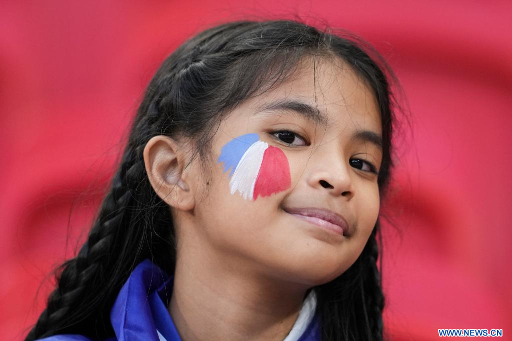 Una aficionada de Francia reacciona previo al partido correspondiente a los octavos de final entre Francia y Polonia en la Copa Mundial de la FIFA 2022, en el Estadio Al Thumama, en Doha, Qatar, el 4 de diciembre de 2022. (Xinhua/Zheng Huansong)