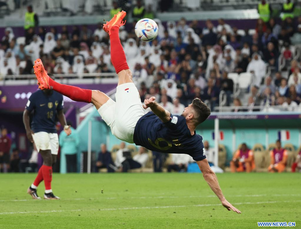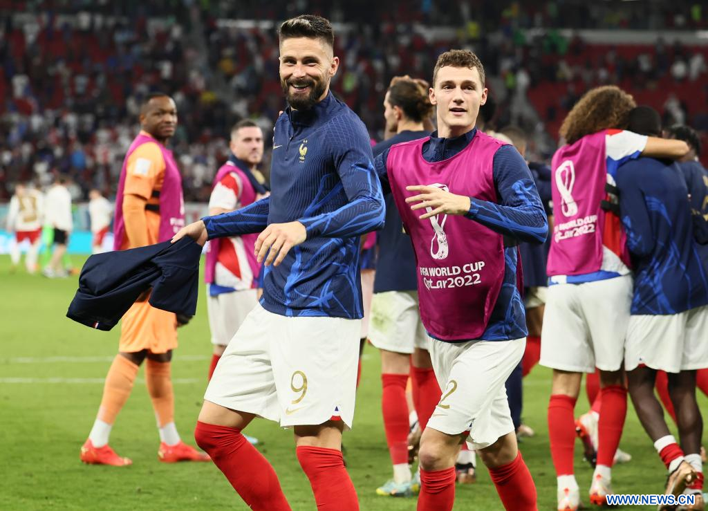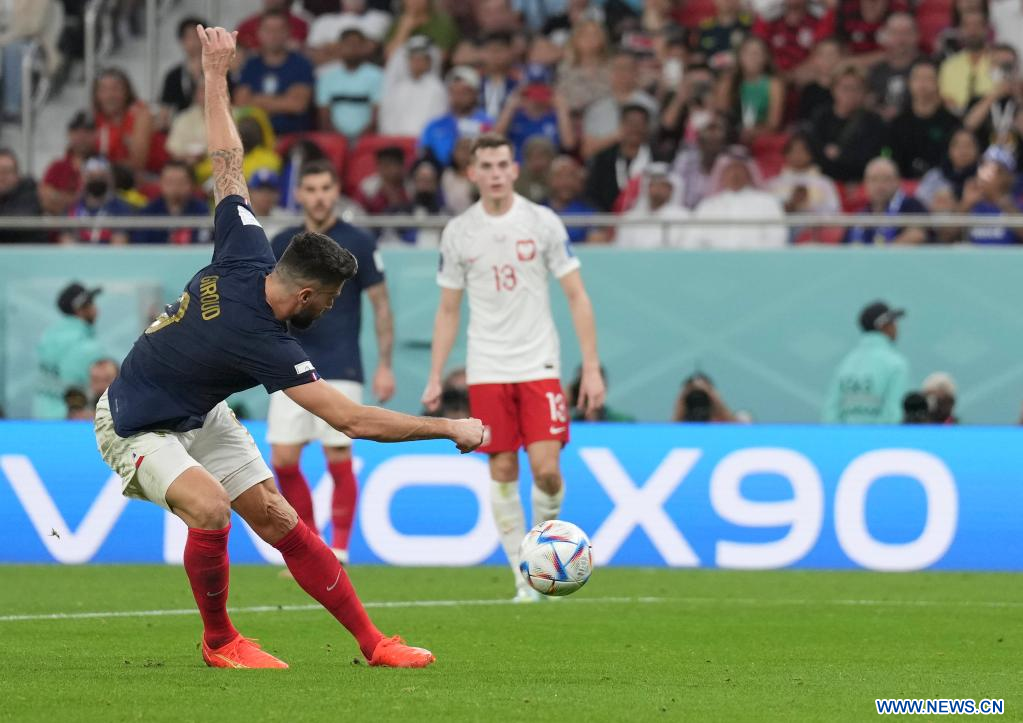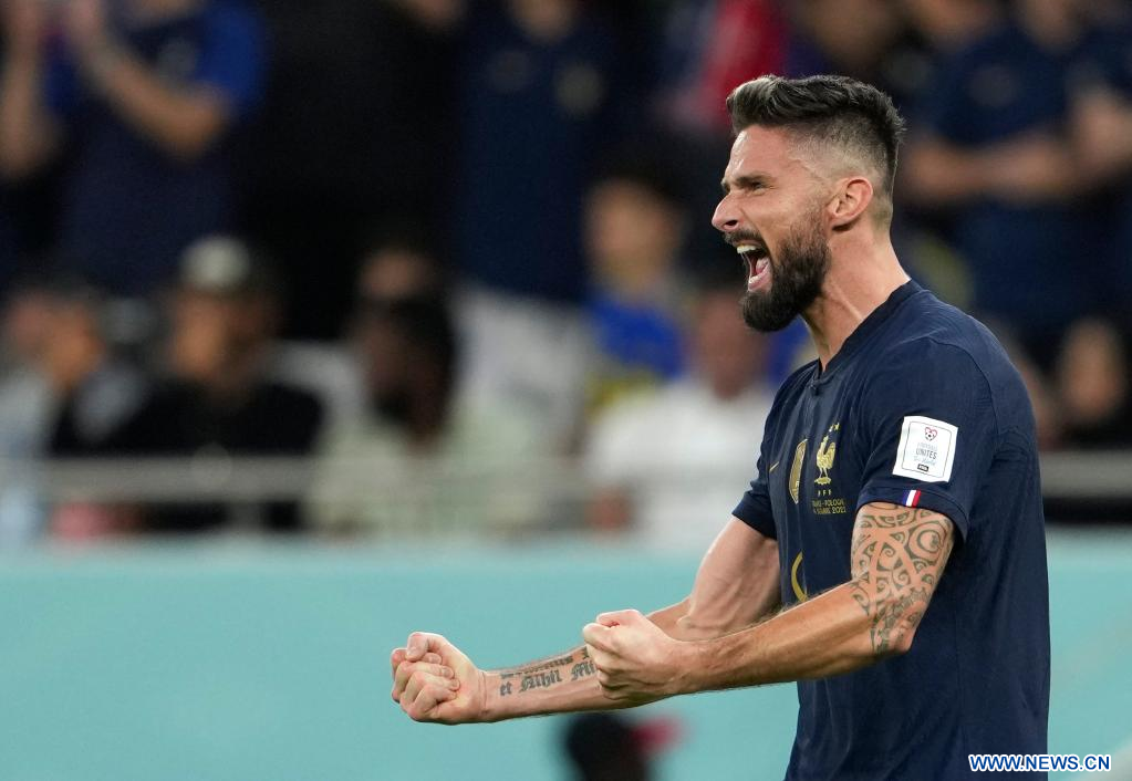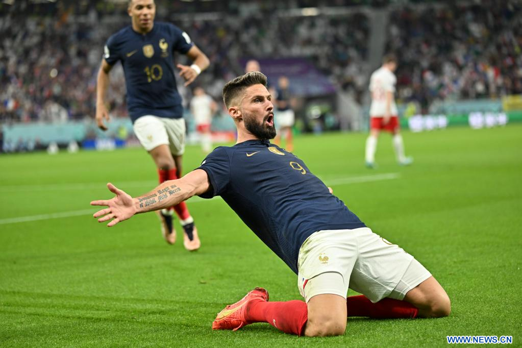 Olivier Giroud, de Francia, festeja su anotación durante el partido correspondiente a los octavos de final entre Francia y Polonia en la Copa Mundial de la FIFA 2022, en el Estadio Al Thumama, en Doha, Qatar, el 4 de diciembre de 2022. (Xinhua/Xiao Yijiu)