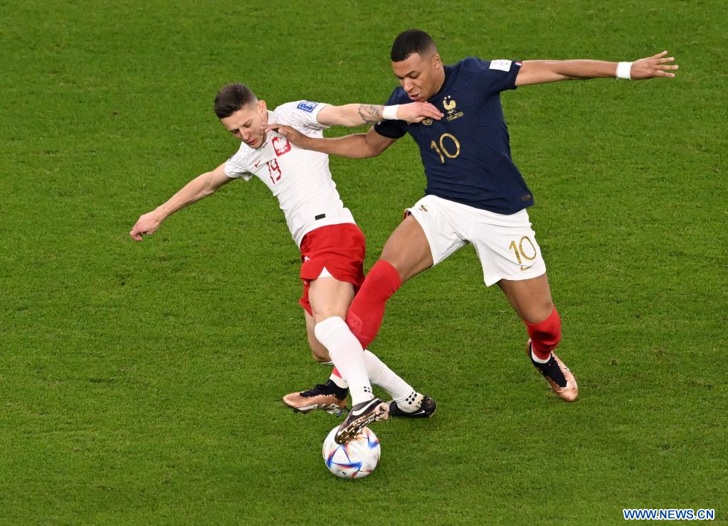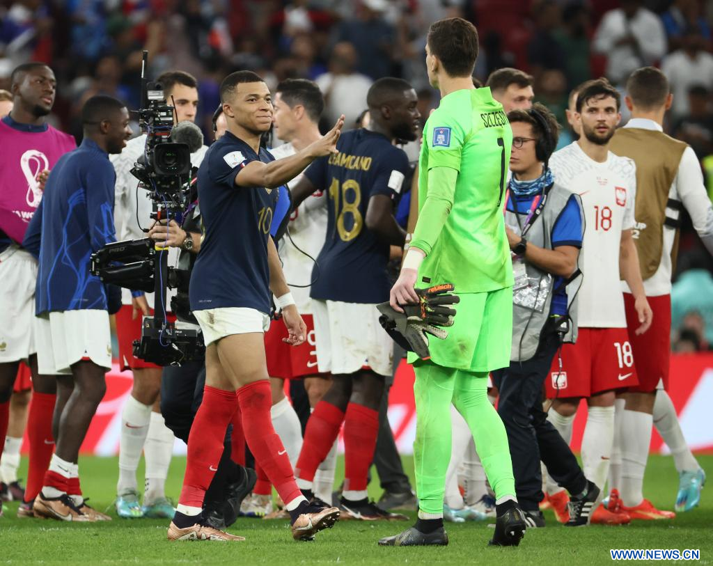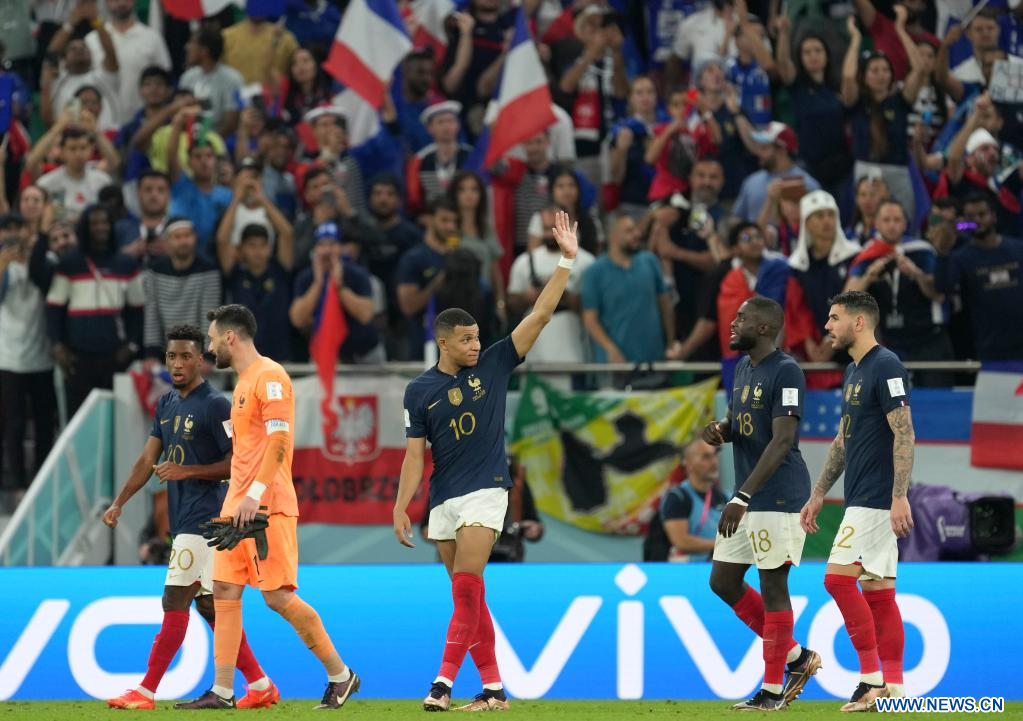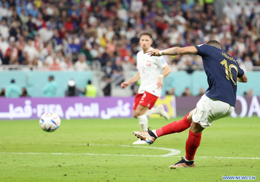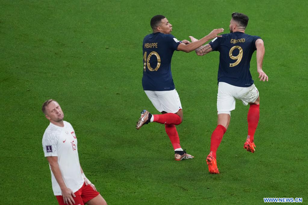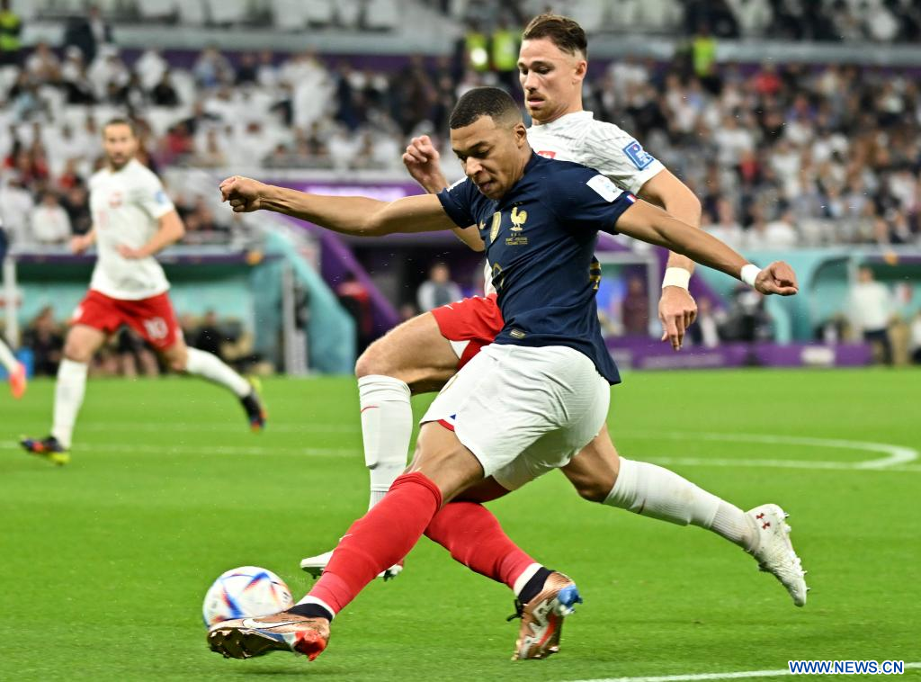 DOHA, 5 dic (Xinhua) -- Kylian Mbappe anotó dos goles y contribuyó a otro para que Francia, campeona defensora, avanzara a los cuartos de final de la Copa Mundial con una victoria de 3-1 sobre Polonia el domingo en Doha.