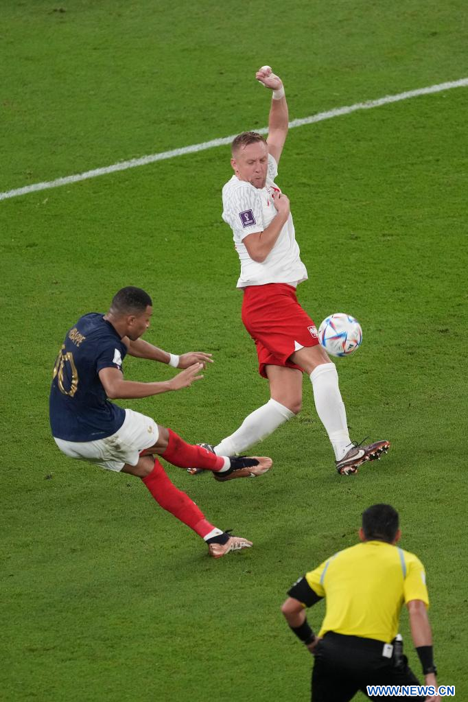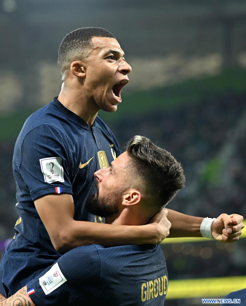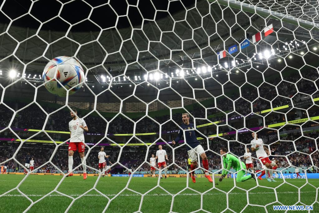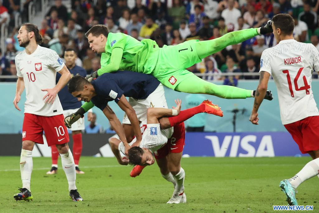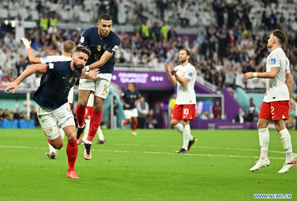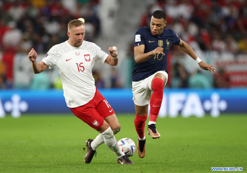 DOHA, 5 dic (Xinhua) -- Kylian Mbappe anotó dos goles y contribuyó a otro para que Francia, campeona defensora, avanzara a los cuartos de final de la Copa Mundial con una victoria de 3-1 sobre Polonia el domingo en Doha.