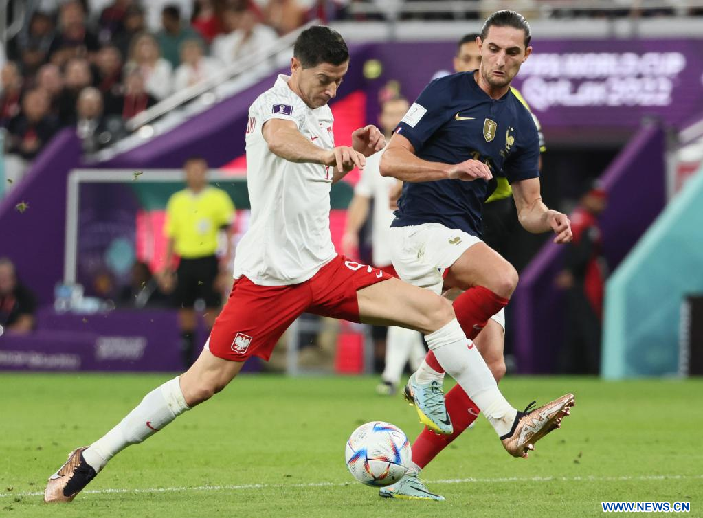 Arkadiusz Milik (d-frente), de Polonia, patea el balón durante el partido correspondiente a los octavos de final entre Francia y Polonia en la Copa Mundial de la FIFA 2022, en el Estadio Al Thumama, en Doha, Qatar, el 4 de diciembre de 2022. (Xinhua/Xiao Yijiu)