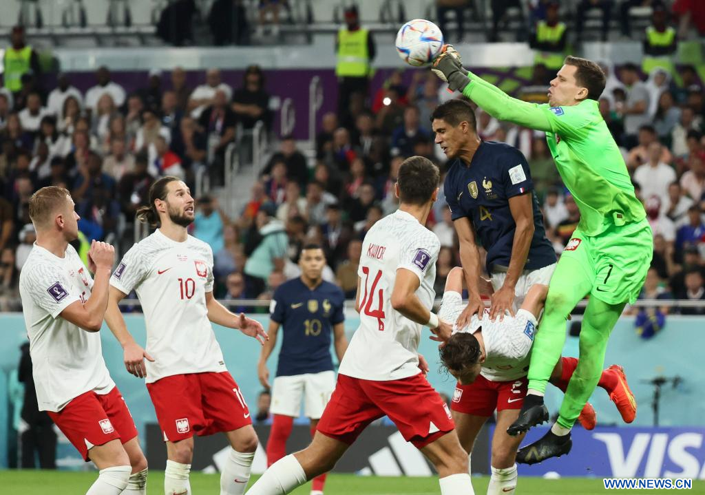 Wojciech Szczesny (d), guardameta de Polonia, ataja el balón durante el partido correspondiente a los octavos de final entre Francia y Polonia en la Copa Mundial de la FIFA 2022, en el Estadio Al Thumama, en Doha, Qatar, el 4 de diciembre de 2022. (Xinhua/Xia Yifang)