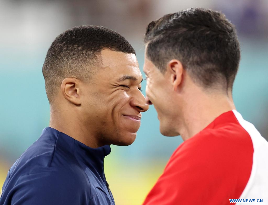 Kylian Mbappe (i), de Francia, reacciona junto a Robert Lewandowski, de Polonia, previo al partido correspondiente a los octavos de final entre Francia y Polonia en la Copa Mundial de la FIFA 2022, en el Estadio Al Thumama, en Doha, Qatar, el 4 de diciembre de 2022. (Xinhua/Cao Can)
