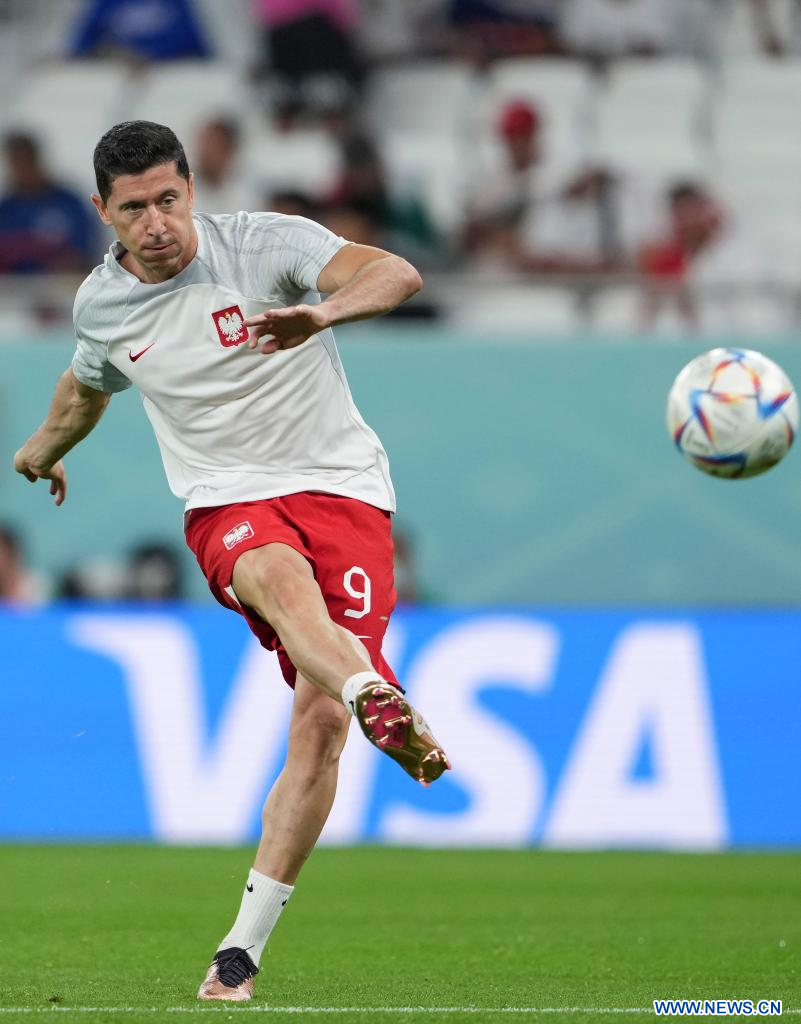 Robert Lewandowski, de Polonia, calienta previo al partido correspondiente a los octavos de final entre Francia y Polonia en la Copa Mundial de la FIFA 2022, en el Estadio Al Thumama, en Doha, Qatar, el 4 de diciembre de 2022. (Xinhua/Zheng Huansong)