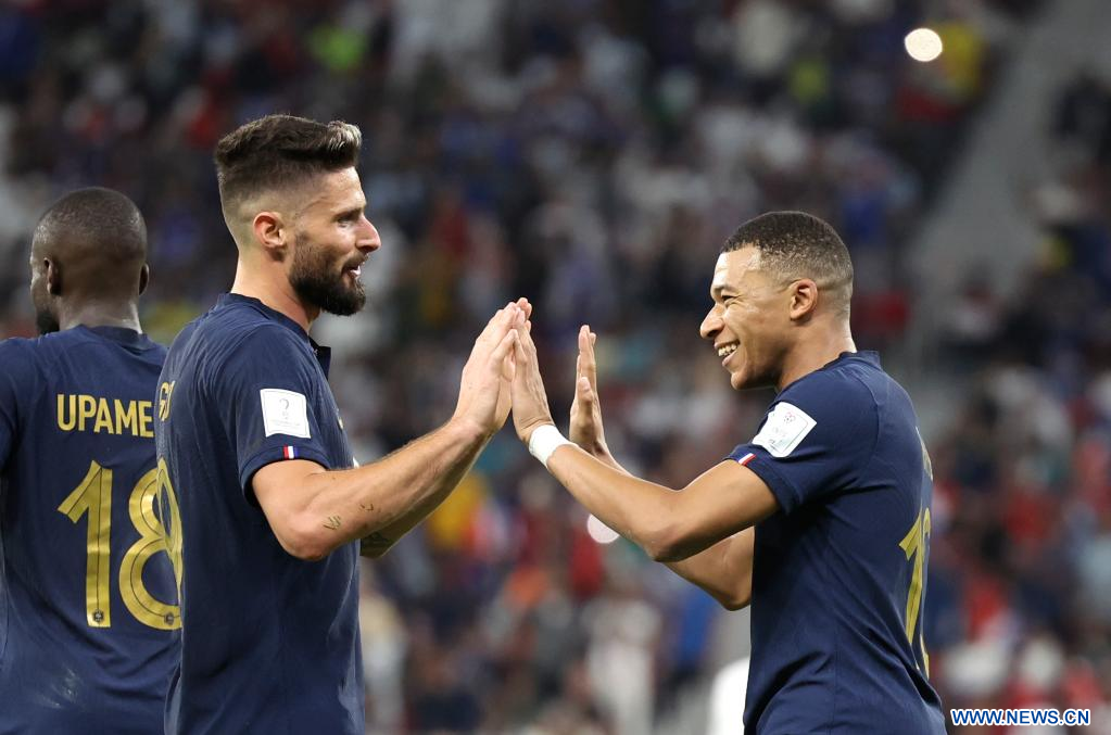 Olivier Giroud (d), de Francia, festeja su anotación con su compañero Kylian Mbappe, durante el partido correspondiente a los octavos de final entre Francia y Polonia en la Copa Mundial de la FIFA 2022, en el Estadio Al Thumama, en Doha, Qatar, el 4 de diciembre de 2022. (Xinhua/Xiao Yijiu)