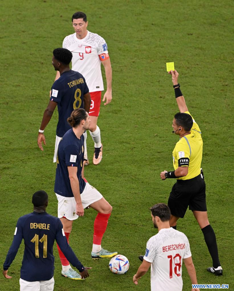 Aurelien Tchouameni (#8), de Francia, recibe una tarjeta amarilla del árbitro Jesús Valenzuela Sáez, durante el partido correspondiente a los octavos de final entre Francia y Polonia en la Copa Mundial de la FIFA 2022, en el Estadio Al Thumama, en Doha, Qatar, el 4 de diciembre de 2022. (Xinhua/Xia Yifang)