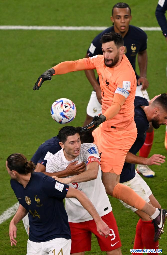 Hugo Lloris (3-d), guardameta de Francia, pierde el balón durante el partido correspondiente a los octavos de final entre Francia y Polonia en la Copa Mundial de la FIFA 2022, en el Estadio Al Thumama, en Doha, Qatar, el 4 de diciembre de 2022. (Xinhua/Xia Yifang)