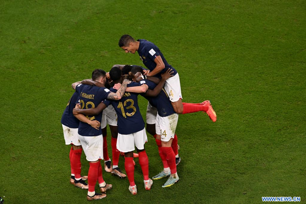 Jugadores de Francia festejan su anotación durante el partido correspondiente a los octavos de final entre Francia y Polonia en la Copa Mundial de la FIFA 2022, en el Estadio Al Thumama, en Doha, Qatar, el 4 de diciembre de 2022. (Xinhua/Xia Yifang)
