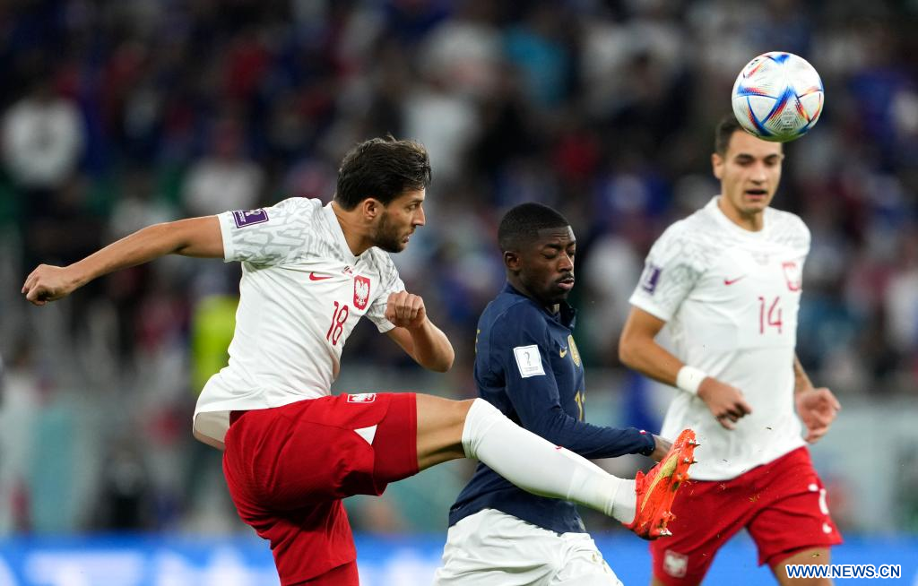 Bartosz Bereszynski (i), de Polonia, Ousmane Dembele (c), de Francia y Jakub Kiwior, de Polonia, compiten durante el partido correspondiente a los octavos de final entre Francia y Polonia en la Copa Mundial de la FIFA 2022, en el Estadio Al Thumama, en Doha, Qatar, el 4 de diciembre de 2022. (Xinhua/Zheng Huansong)