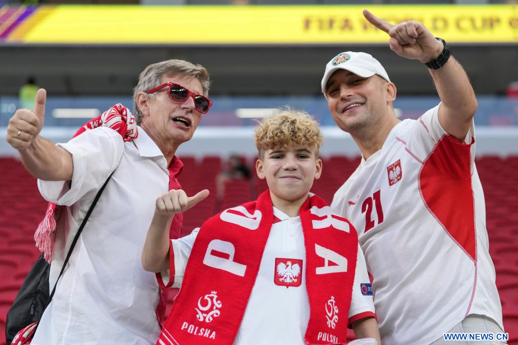 Aficionados de Polonia posan para fotografías previo al partido correspondiente a los octavos de final entre Francia y Polonia en la Copa Mundial de la FIFA 2022, en el Estadio Al Thumama, en Doha, Qatar, el 4 de diciembre de 2022. (Xinhua/Zheng Huansong)
