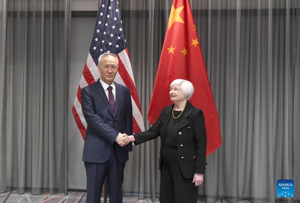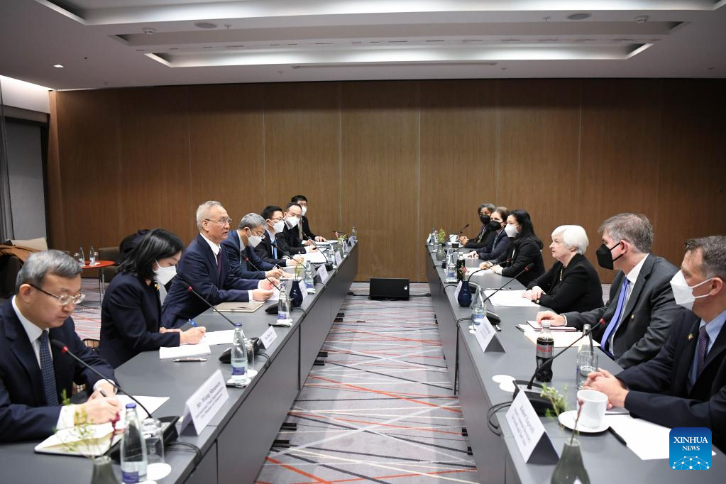 ZÚRICH, Suiza, 18 ene (Xinhua) -- El viceprimer ministro chino Liu He, también jefe de la parte china del diálogo económico integral China-Estados Unidos, sostuvo conversaciones hoy miércoles en Zúrich con la secretaria del Tesoro estadounidense, Janet Yellen.