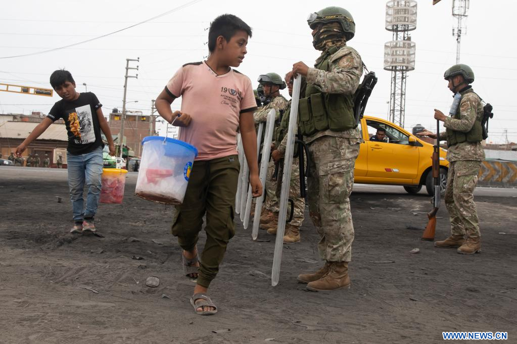 ICA, 31 enero, 2023 (Xinhua) -- Niños caminan frente a soldados que vigilan después de retirar un bloqueo de protesta en la carretera Panamericana Sur, en Ica, Perú, el 31 de enero de 2023. Las nuevas jornadas violentas se produjeron en el marco de las protestas que se registran en varias partes del país, teniendo como exigencias la renuncia de la presidenta Dina Boluarte, el cierre del Congreso, el adelanto de las elecciones a este 2023 y una asamblea constituyente. (Xinhua/Mariana Bazo)