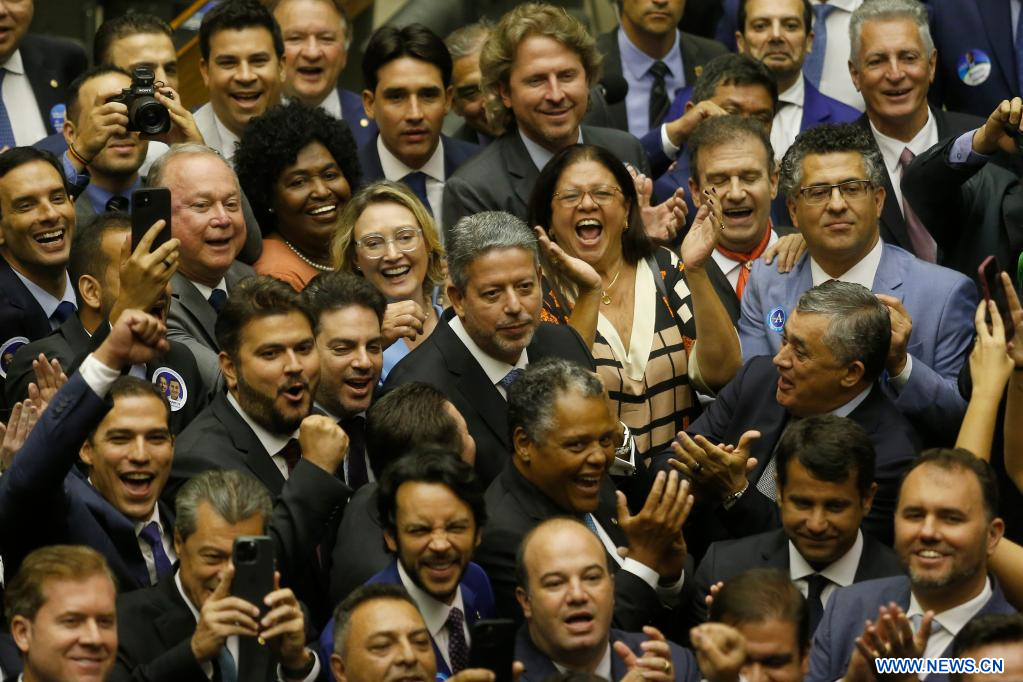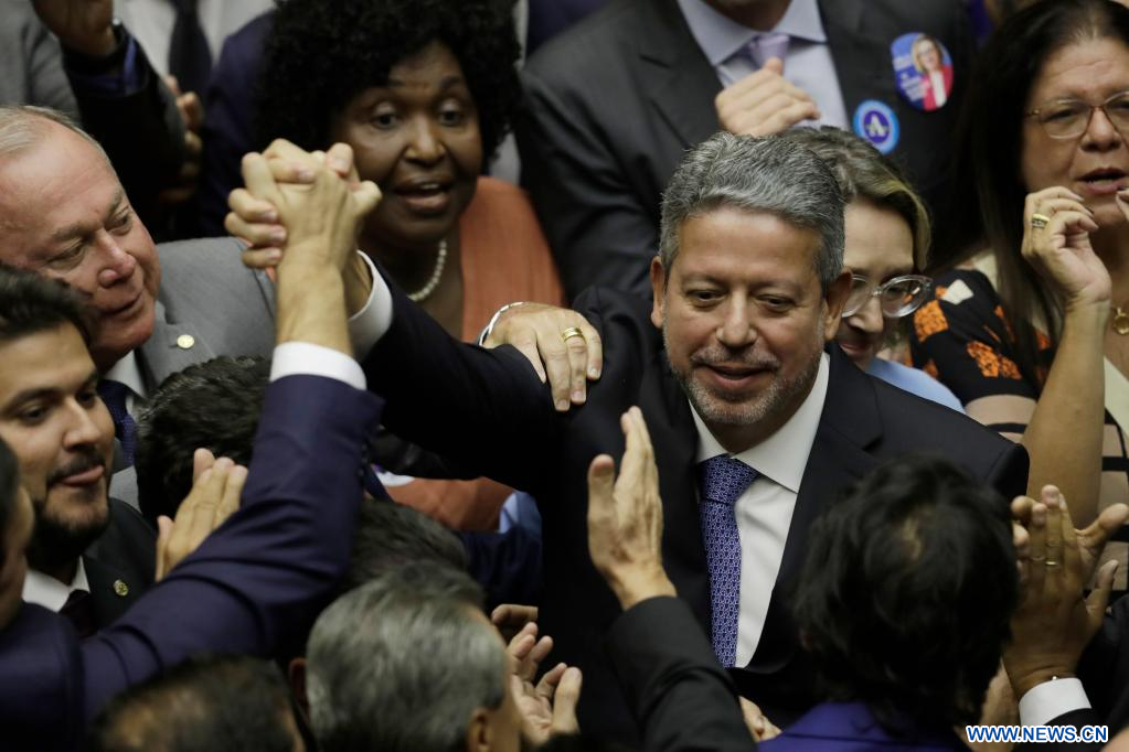 BRASILIA, 1 febrero, 2023 (Xinhua) -- El presidente de la Cámara de Diputados de Brasil, Arthur Lira (d-frente), festeja después de ser reelegido, en Brasilia, Brasil, el 1 de febrero de 2023. (Xinhua/Lucio Tavora)
