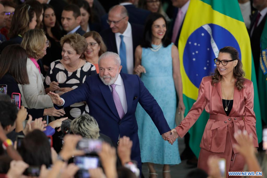 BRASILIA, 8 marzo, 2023 (Xinhua) -- El presidente brasileño, Luiz Inácio Lula da Silva (i-frente), y la primera dama brasileña, Rosangela da Silva (d), llegan a la ceremonia de conmemoración del Día Internacional de la Mujer y el anuncio de una serie de acciones, en el Palacio de Planalto, en Brasilia, Brasil, 8 de marzo de 2023. Lula da Silva anunció el miércoles, en el marco del Día Internacional de la Mujer, un proyecto de ley para prohibir el pago de salarios diferentes a hombres y mujeres que desempeñen el mismo trabajo. (Xinhua/Lucio Tavora)
