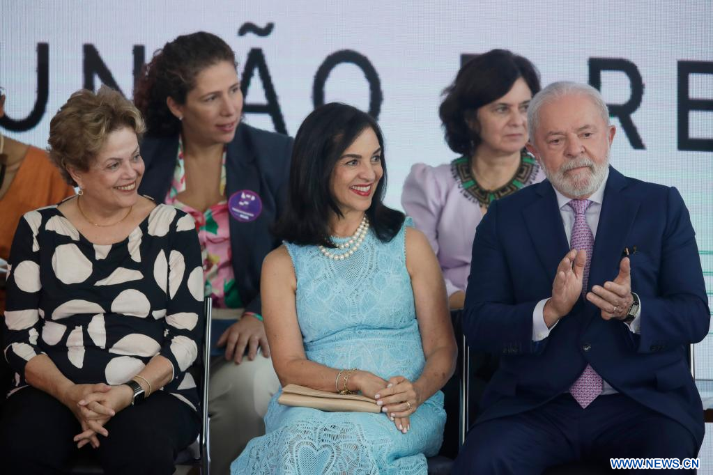 El presidente brasileño, Luiz Inácio Lula da Silva (d), Maria Lúcia Ribeiro Alckmin (c), esposa del vicepresidente brasileño, Geraldo Alckmin, y la expresidenta brasileña, Dilma Rousseff (i), participan durante la ceremonia de conmemoración del Día Internacional de la Mujer y el anuncio de una serie de acciones, en el Palacio de Planalto, en Brasilia, Brasil, 8 de marzo de 2023. Lula da Silva anunció el miércoles, en el marco del Día Internacional de la Mujer, un proyecto de ley para prohibir el pago de salarios diferentes a hombres y mujeres que desempeñen el mismo trabajo. (Xinhua/Lucio Tavora)