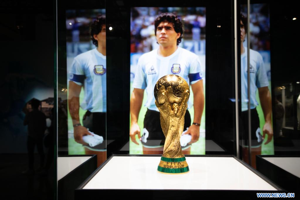BUENOS AIRES, 5 abril, 2023 (Xinhua) -- La Copa del Mundo obtenida por la selección de fútbol de Argentina en la Copa Mundial de México 1986 es exhibida durante la exposición oficial de la Asociación del Fútbol Argentino "Campeones del Mundo" en el predio ferial La Rural, en Buenos Aires, Argentina, el 5 de abril de 2023. (Xinhua/Martín Zabala)