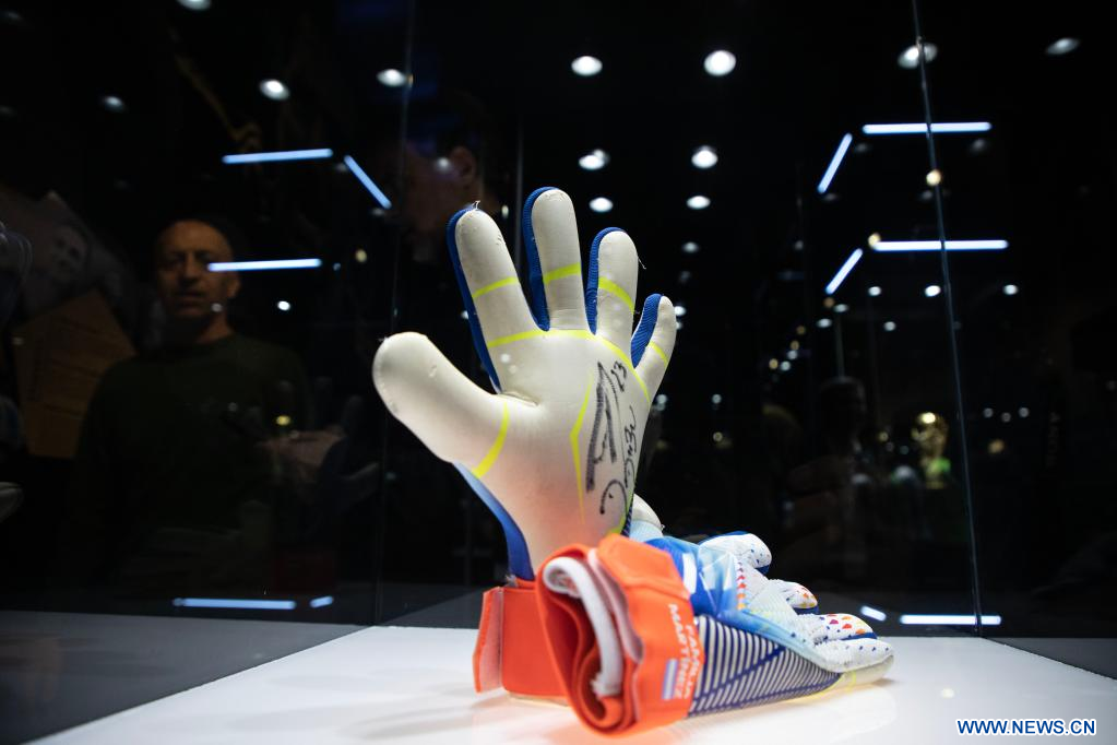 BUENOS AIRES, 5 abril, 2023 (Xinhua) -- Los guantes utilizados y autografiados por el guardameta argentino, Emiliano Martínez, durante la Copa Mundial de Qatar 2022 son exhibidos en la exposición oficial de la Asociación del Fútbol Argentino "Campeones del Mundo" en el predio ferial La Rural, en Buenos Aires, Argentina, el 5 de abril de 2023. (Xinhua/Martín Zabala)