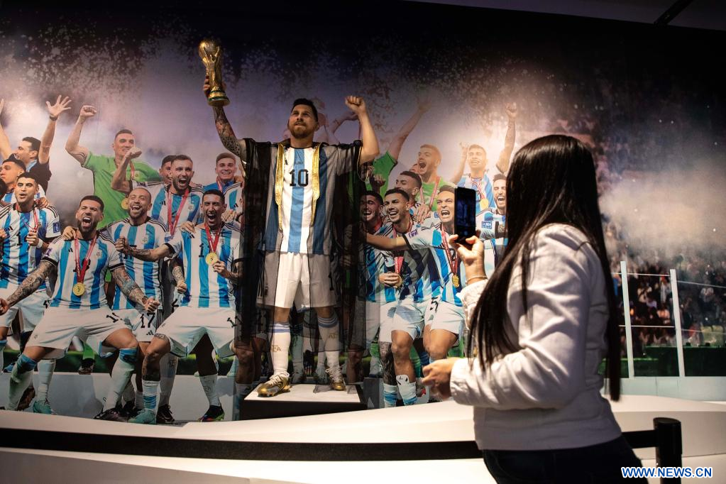 Una mujer toma una fotografía a una estatua de Lionel Messi en la Copa Mundial de Qatar 2022 durante la exposición oficial de la Asociación del Fútbol Argentino "Campeones del Mundo" en el predio ferial La Rural, en Buenos Aires, Argentina, el 5 de abril de 2023. (Xinhua/Martín Zabala)
