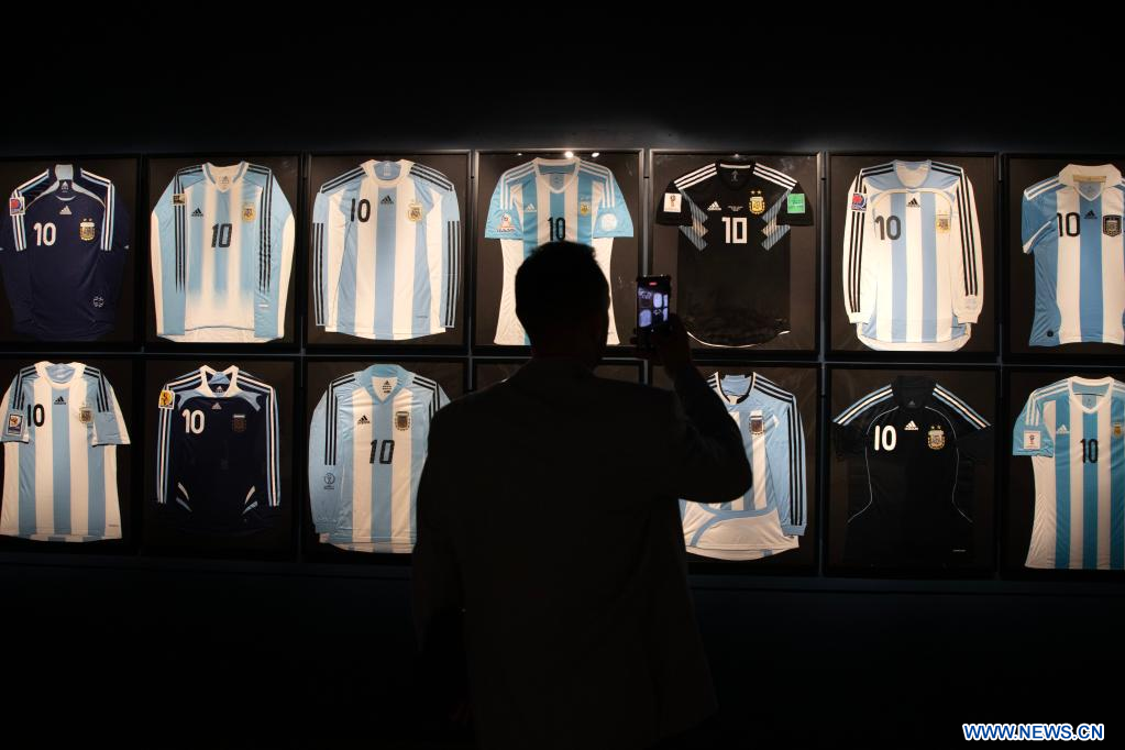 BUENOS AIRES, 5 abril, 2023 (Xinhua) -- Camisetas con el número "10" son exhibidas durante la exposición oficial de la Asociación del Fútbol Argentino "Campeones del Mundo" en el predio ferial La Rural, en Buenos Aires, Argentina, el 5 de abril de 2023. (Xinhua/Martín Zabala)