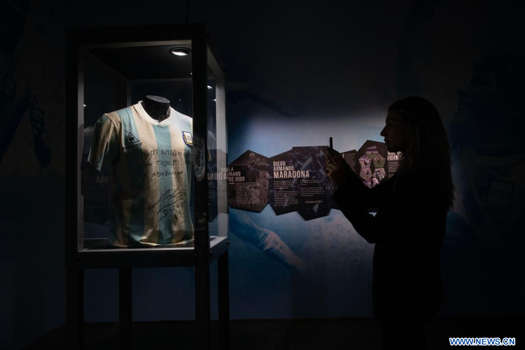 BUENOS AIRES, 5 abril, 2023 (Xinhua) -- Una mujer toma una fotografía a una camiseta firmada y utilizada por Diego Armando Maradona en la Copa Mundial de México 1986 durante la exposición oficial de la Asociación del Fútbol Argentino "Campeones del Mundo" en el predio ferial La Rural, en Buenos Aires, Argentina, el 5 de abril de 2023. (Xinhua/Martín Zabala)