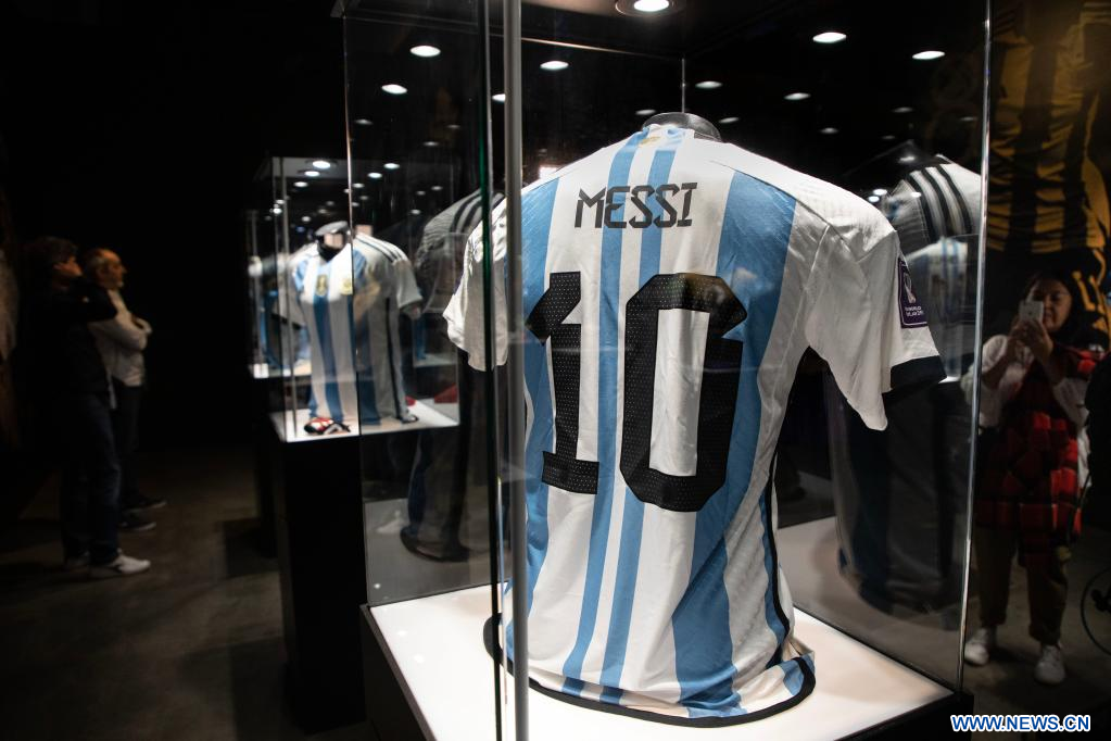 BUENOS AIRES, 5 abril, 2023 (Xinhua) -- Una camiseta utilizada por el jugador argentino, Lionel Messi, durante la Copa Mundial de Qatar 2022 es exhibida en la exposición oficial de la Asociación del Fútbol Argentino "Campeones del Mundo" en el predio ferial La Rural, en Buenos Aires, Argentina, el 5 de abril de 2023. (Xinhua/Martín Zabala)