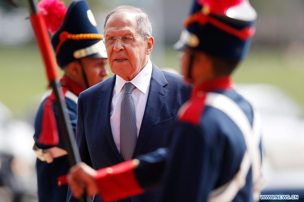BRASILIA, 17 abril, 2023 (Xinhua) -- El ministro de Relaciones Exteriores ruso, Sergey Lavrov, llega a una reunión de trabajo con el ministro de Relaciones Exteriores brasileño, Mauro Vieira, en el Palacio de Itamaraty, en Brasilia, Brasil, el 17 de abril de 2023. (Xinhua/Lucio Tavora)