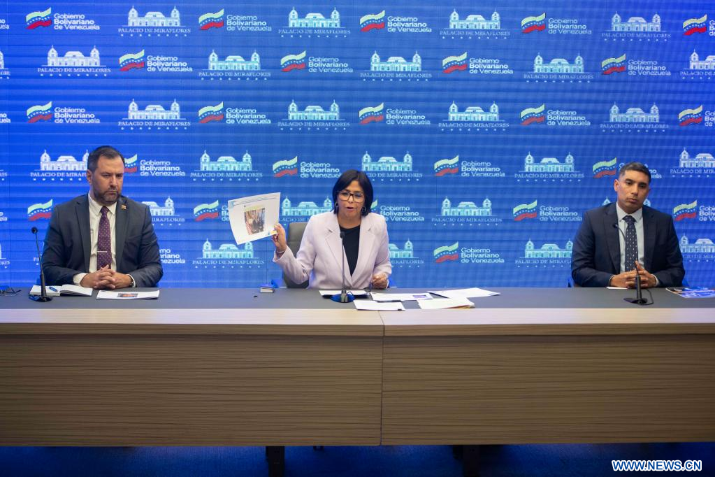 CARACAS, 3 mayo, 2023 (Xinhua) -- La vicepresidenta venezolana, Delcy Rodríguez (c), habla durante una conferencia de prensa junto al canciller venezolano, Yván Gil (i), y al presidente de la estatal Petróleos de Venezuela (PDVSA), Pedro Tellechea (d), en el Palacio de Miraflores, en Caracas, Venezuela, el 3 de mayo de 2023. El Gobierno de Venezuela anunció el miércoles que no reconocerá ningún acto ni negociación en el marco de la denominada licencia 42, en la que Estados Unidos autoriza a un sector de la oposición venezolana a negociar acciones de Citgo Petroleum Corporation, filial de la estatal PDVSA. (Xinhua/Marcos Salgado)