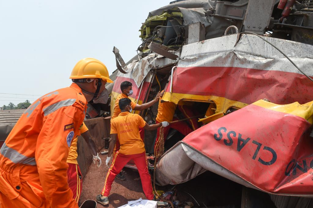NUEVA DELHI, 3 junio, 2023 (Xinhua) -- Rescatistas trabajan en el sitio de una colisión de trenes, en el distrito de Balasore, en el estado de Odisha, en el este de India, el 3 de junio de 2023. Más de 200 personas murieron y otras 900 resultaron heridas el viernes por la noche en un grave accidente ferroviario de tres trenes en el estado oriental indio de Odisha, informaron el sábado funcionarios del país. El accidente ocurrió alrededor de las 19:20 hora local cerca de la estación Bahanaga Bazar, en el distrito de Balasore, a unos 171 kilómetros al noreste de Bhubaneswar, capital de Odisha. (Xinhua/Javed Dar)