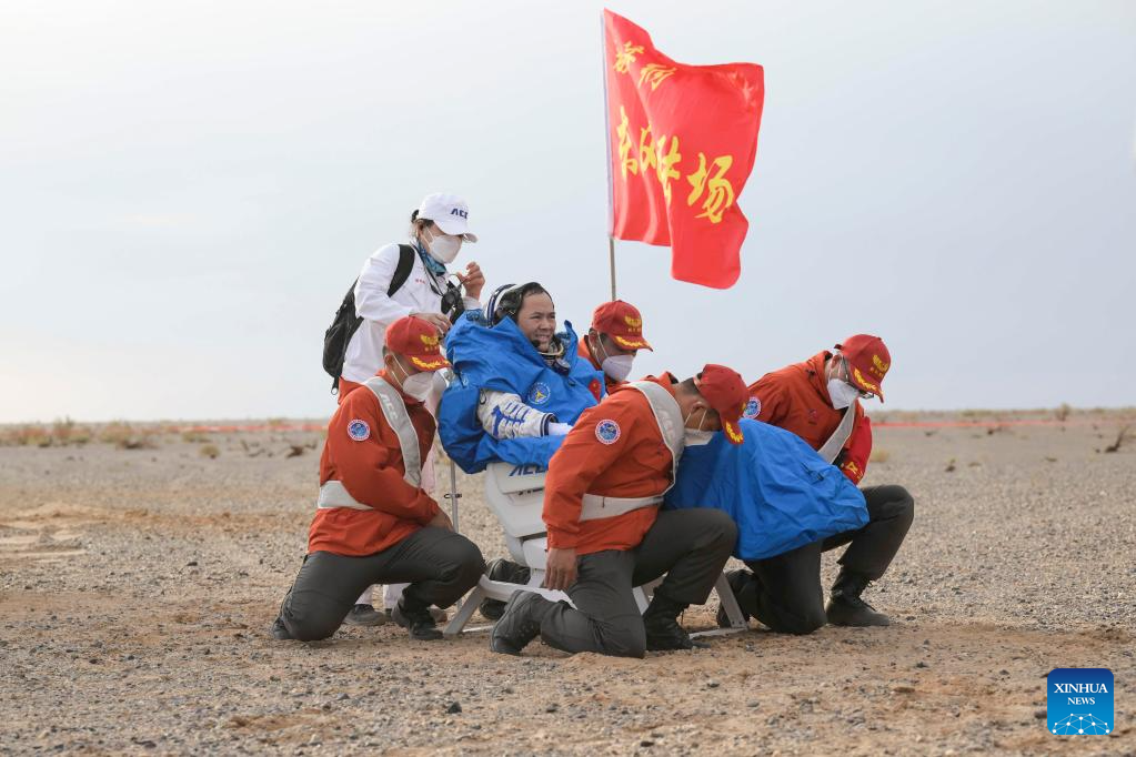 Astronaut Fei Junlong is out of the return capsule of the Shenzhou-15 manned spaceship at the Dongfeng landing site in north China's Inner Mongolia Autonomous Region June 4, 2023. The return capsule of the Shenzhou-15 manned spaceship, carrying astronauts Fei Junlong, Deng Qingming and Zhang Lu, touched down at the Dongfeng landing site in north China's Inner Mongolia Autonomous Region safely on Sunday. (Xinhua/He Shuchen)