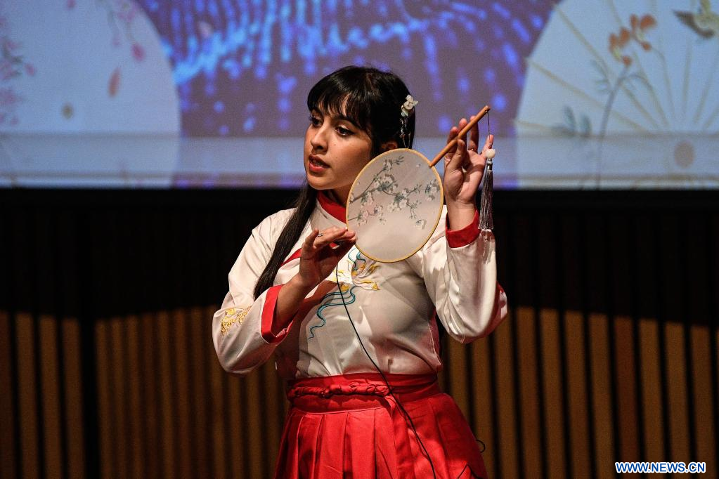 Imagen del 8 de junio de 2023 de una participante realizando una presentación durante la final nacional del concurso "Puente Chino 2023" de estudiantes secundarios y universitarios en el Instituto Confucio de la Pontificia Universidad Católica de Chile, en la ciudad de Santiago, capital de Chile. Dos estudiantes que viven en el sur de Chile ganaron el concurso "Puente Chino 2023" de estudiantes secundarios y universitarios del país sudamericano celebrado el jueves pasado, un certamen que se celebra desde 2010 en territorio chileno y que brinda a los jóvenes una oportunidad para practicar y perfeccionar sus conocimientos sobre el idioma chino. (Xinhua/Jorge Villegas)