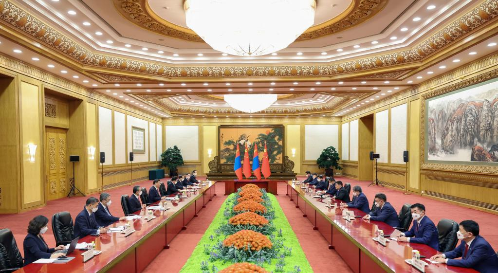 Mongolia está dispuesta a trabajar con China para hacer de las relaciones Mongolia-China un ejemplo para las relaciones entre países, indicó Oyun-Erdene. Prometió que Mongolia se adhiere al principio de una sola China, apoya la posición de China sobre Taiwan, el Tíbet y Xinjiang, así como la Iniciativa para el Desarrollo Global, la Iniciativa para la Seguridad Global y la Iniciativa para la Civilización Global propuestas por China.