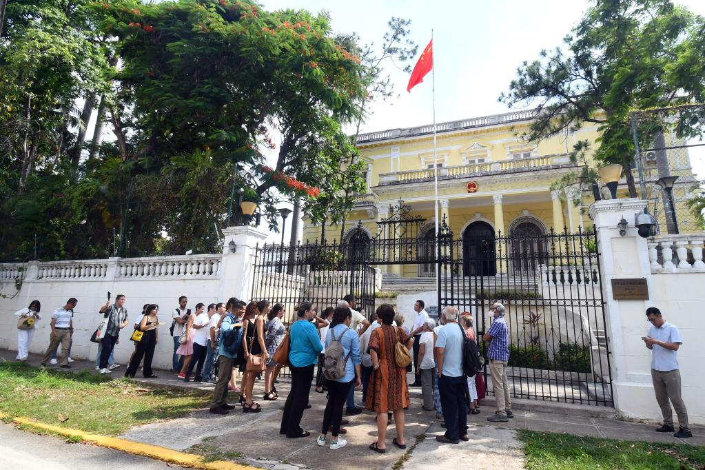 Imagen del 30 de junio de 2023 de un grupo de personas en la entrada de la embajada de China en Cuba, en La Habana, capital de Cuba. La señorial mansión sede de la embajada de China en La Habana, abrió sus puertas al público junto a otros siete inmuebles considerados como joyas del patrimonio arquitectónico de Cuba. (Xinhua/Joaquín Hernández)