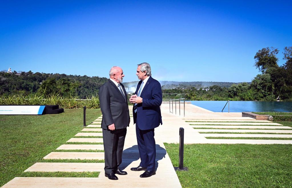PUERTO IGUAZU, 4 julio, 2023 (Xinhua) -- Imagen proveída por la Agencia de Noticias Télam del presidente argentino, Alberto Fernández (d), conversando con el presidente brasileño, Luiz Inácio Lula da Silva (i), durante la LXII Reunión del Consejo del Mercado Común y Cumbre de Jefes y Jefas de Estado del Mercado Común del Sur (Mercosur) y Estados Asociados, en la ciudad de Puerto Iguazú, Argentina, el 4 de julio de 2023. Los presidentes de los países que integran el Mercosur iniciaron el martes su Cumbre de Jefes de Estado y Estados Asociados, en el Parque Nacional Iguazú, a metros de las majestuosas cataratas de Iguazú, en el noreste de Argentina. (Xinhua/TELAM)