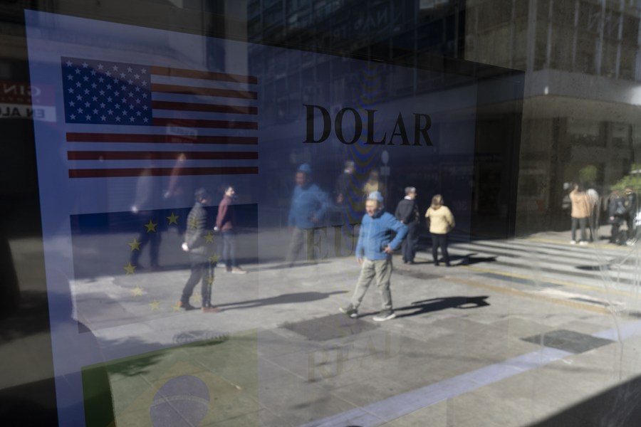 Personas caminan frente a un local de venta de divisas ubicado sobre la peatonal Florida, en Buenos Aires, capital de Argentina, el 20 de julio de 2022. (Xinhua/Martín Zabala)